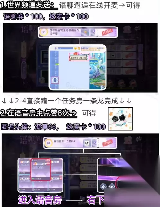 1.任务一 世界频道发送:语聊邂逅在线开麦→可得 语聊券100,炫麦卡100 ↓↓2-4直接蹭一个任务房一条龙完成↓↓ 2.任务二 匿名头像:潦草66,炫麦卡*100