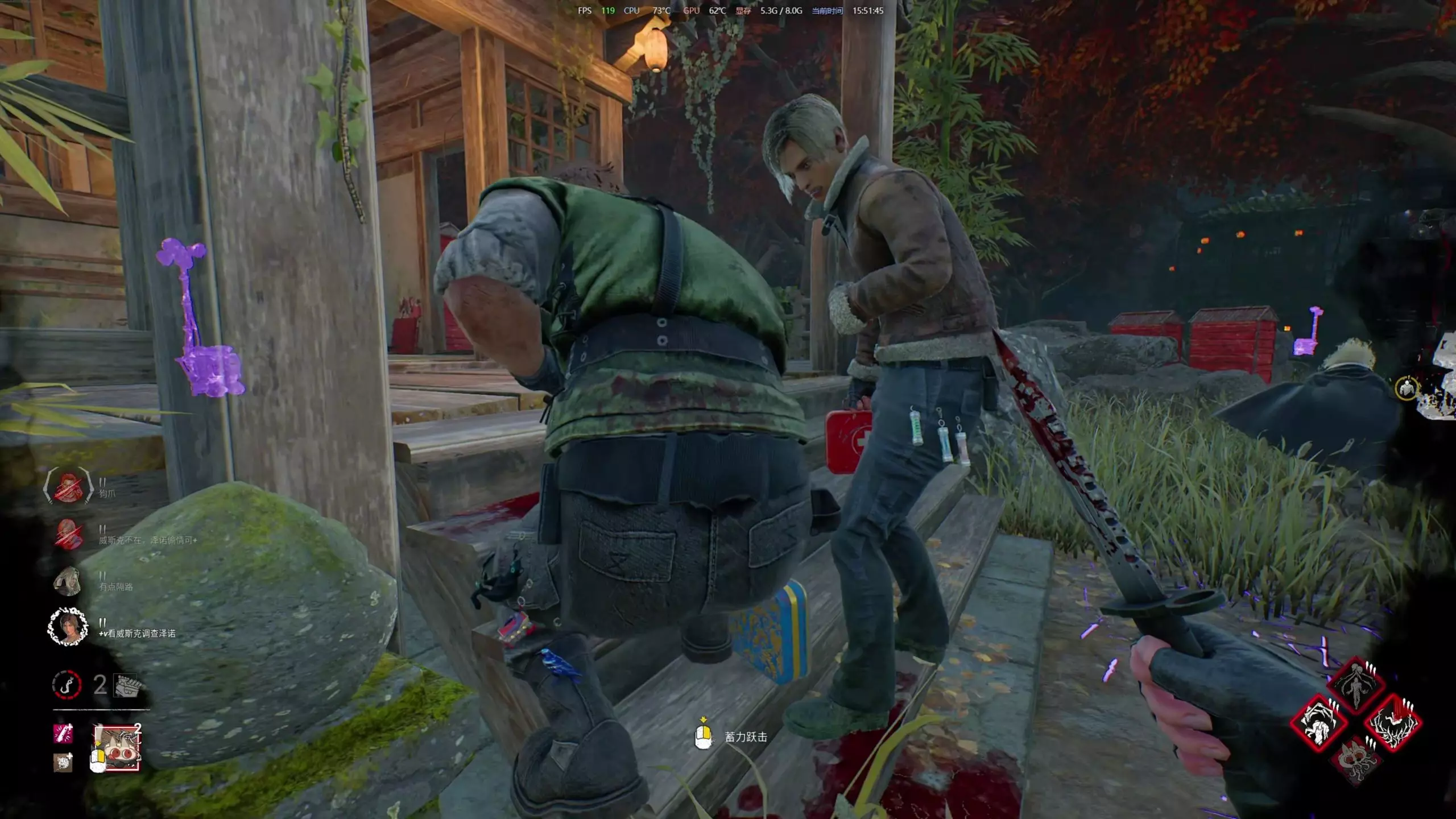 这是《黎明杀机》的游戏内容,展示了四名玩家在游戏里进行开导互动,结果被屠夫巴布发现,随后开启了躲避屠夫追击的惊险游戏过程。