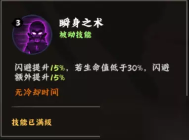 3技能:瞬身之术 闪避提升15%,若生命值低于30%,闪避额外提升15% 高额闪避,生存技能 概率防止被秒,但看脸