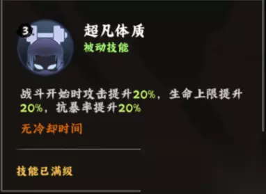 4技能:超凡体质 战斗开始时攻击提升20%,生命上限提升20%,抗暴率提升20% 半肉半输出被动 总结:有高额单体系数,但没有任何增伤加成,配合迈特凯或许有奇效。