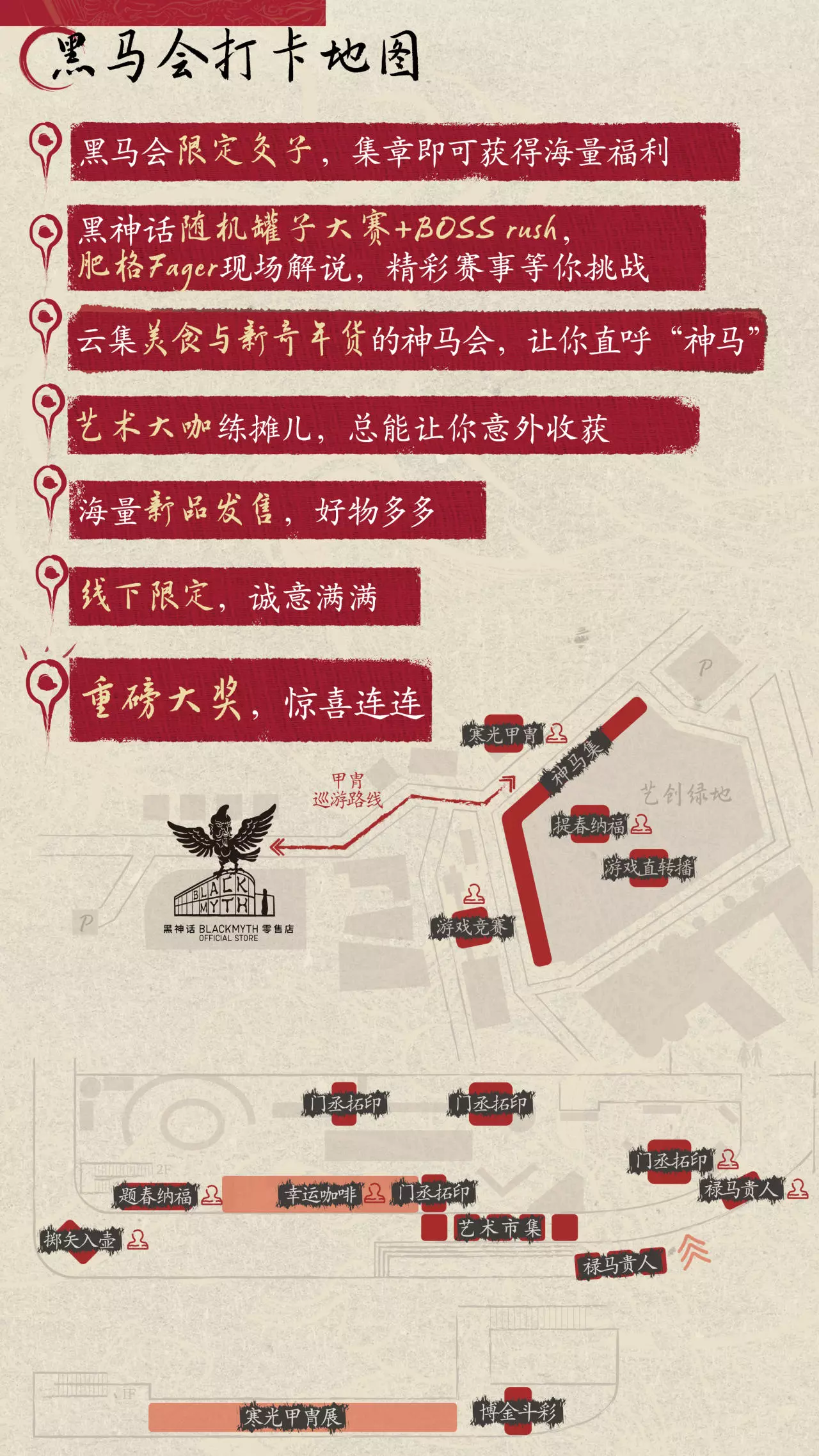 黑神话BLACKMYTH零售店 2026【黑马会】官方推荐的活动流程:先来到黑神话BLACKMYTH零售店入口处领取【通关文牒】及6张空白交子。随后前往店铺内外8个可打卡的互动点参与活动,为空白交子盖上不同的活动章(8选6即可盖满)。几个互动点的活动玩法分别是—— 禄马贵人:书写新年愿望,悬挂祈福牌签寒光甲胄:试穿寒光甲胄团队复原的古代甲胄门丞拓印:使用拓印或套印的方式来完成春节年画题春纳福:领取由艺术家现场题写的福字(包含店内/草坪两个地点可分别盖章)掷矢入壶:参与投壶游戏,每人5次机会,全中有额外奖品游戏竞赛:挑战齐天难度的指定Boss复战,每日5名成绩最佳者有额外奖品(草坪附近)幸运咖啡:在黑神话零售店的咖啡店任意消费可盖章并参与抽奖