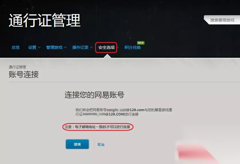 四、登录暴雪游戏通行证之后,通过安全选项内的账号连接,点击继续,确认网易账号成功连接暴雪游戏通行证。