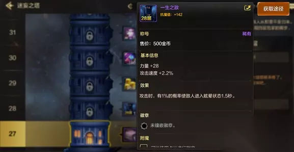 4、中期过渡:迷妄之塔通关特定层数,可获得用于过渡的称号,例如通关28层可以获得“一生之敌”称号,可通过每层奖励预览找到可获得的称号。