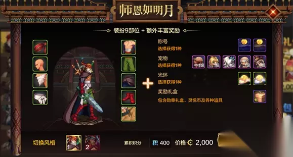 5、毕业称号:目前购买商城礼包【导师套】2000点券档位时,内含一款毕业称号(二选一),同时还有宠物、光环、奖励礼包可多选一。