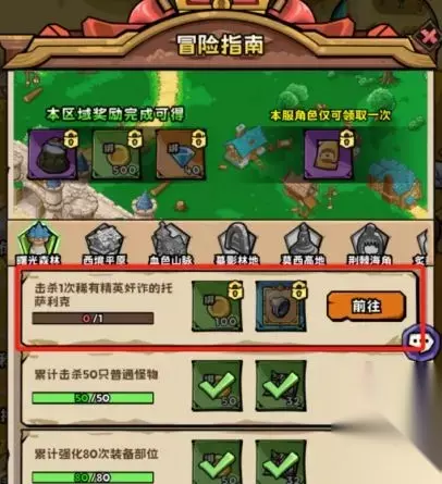 新人进游戏优先跟着主线任务跟新手引导点击各个功能模块尽快熟悉游戏。 1、冒险指南:如果卡进度了可以点击冒险指南查看一下我们是不是某个地图有某些boss没有进行击杀。
