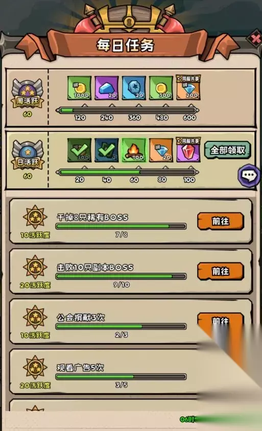 对着日常查漏补缺,每天记得把活跃都做满哦!