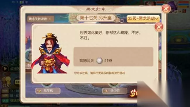 黑龙浩劫是有等级限制区间的副本,目前分为35级、50级、65级、75级、85级五大章节,也就是说,如果我们到达50级,就只能参加50级层次的黑龙浩劫副本,35级层次的便不能再进去,而之前闯过的35级关卡也不能继续进行。同理,往后层次也是如此。所以,我们要尽量争取在副本层次临界点的等级内通关。