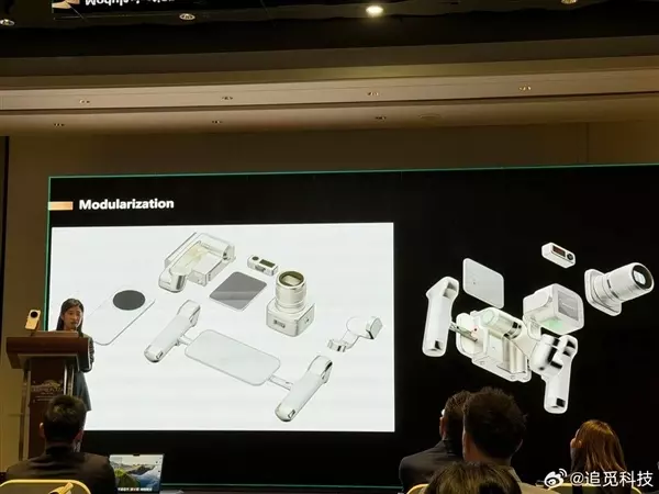 除了外观设计之外,官方还首次揭秘了模块化影像旗舰。从现场图片来看,这款模块化旗舰支持多种多样的影像配件,包括摄像头、手柄、稳定器等等。