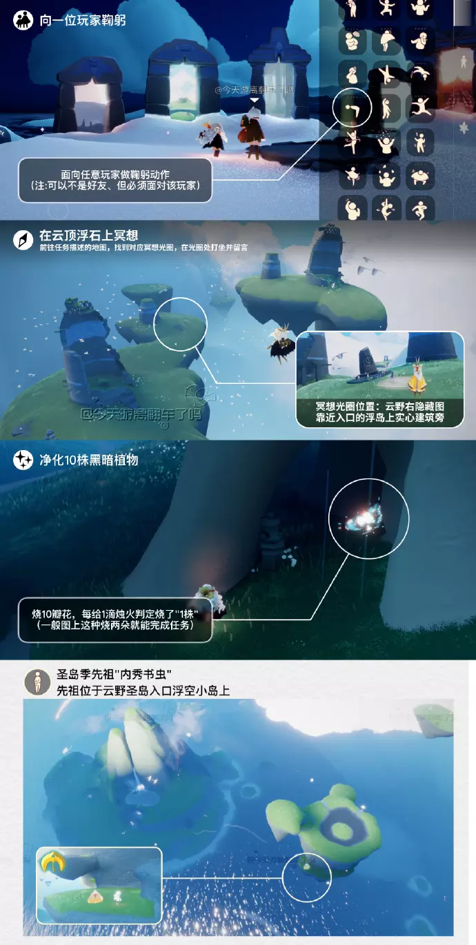 《光遇》游戏中每天的每日任务及大蜡烛的位置都不相同,玩家完成每日任务及收集大蜡烛都可以得到丰厚的兑换奖励,奖励可以用于兑换各种动作及道具,不过很多小伙伴不知道每日任务怎么做,又懒得自己去找大蜡烛的位置,我们汇总了每日任务的完成攻略以及蜡烛位置,一起来看看吧!
