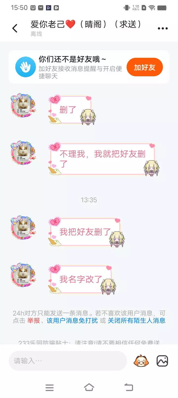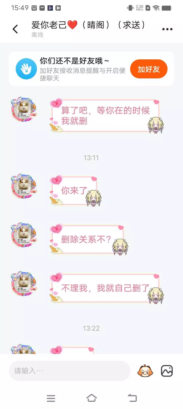 我今天本来心情就不好,一打开手机天塌了!我鬼密把我删了!她说她有了就鬼密?但是看到这几条消息我心脏都要停止了,真的希望不要骗我感情了,可以吗。她发的帖子最近也有我不认识的大佬,我真的很伤心,难道有了大佬鬼密就不要我了吗?我的好友也很少,每和我一起玩的人几乎没有,我只有她了,我却也把我删了,我却无能为力,就算不是好鬼蜜也可以当普通朋友啊!
