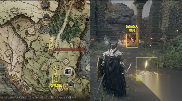 2、前往离出生点不远的赐福点“艾雷教堂”,找到流浪商人咖列对话,此时会出现“关于雾林中的狼嚎”选项。选择后咖列会给与新的肢体动作“弹指”。