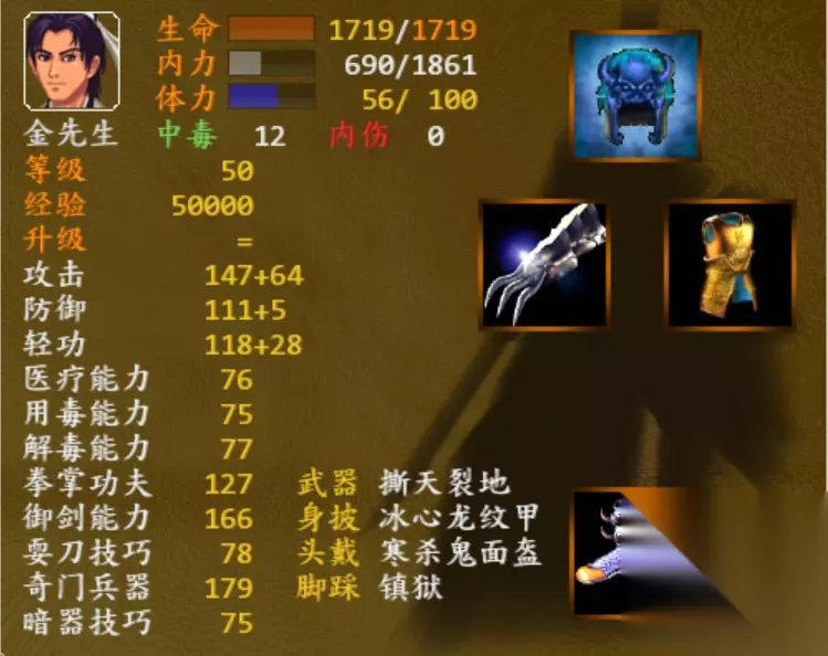 一、修罗套装: 1、隐藏属性:加50攻 、加30轻、 减25防。2、组成部位和获得方式: 武器:撕天裂地(内伤几率增加),剧情进行到笑傲江湖线,击败向问天和梅庄…
