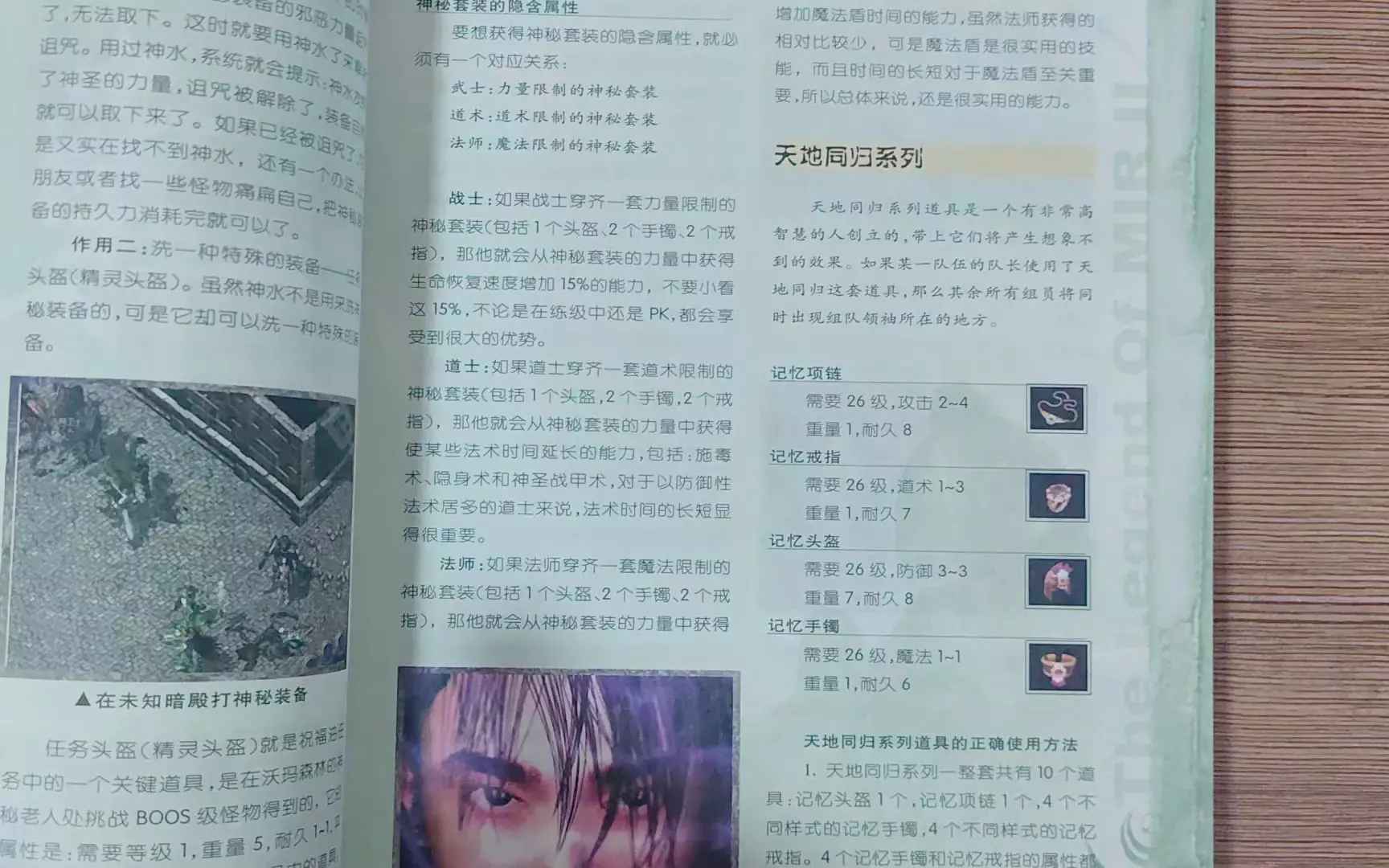这篇内容来自《热血传奇》官方攻略书,介绍了神秘套装的隐藏属性,不同职业对应不同限制的神秘套装,穿齐后战士可提升15%生命恢复速度,道士能延长部分法术时间,法师可增加魔法盾时长,还提及天地同归系列道具的效果。