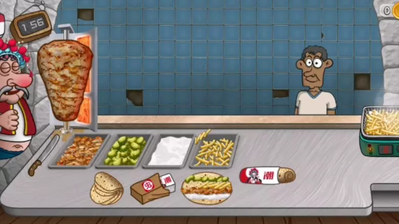 这是游戏沙威玛传奇的国潮改造画面,摊位老板换成了国潮戏曲扮相,做好的沙威玛卷饼用上了设计精美的国潮包装,国潮包装颜值高设计亮眼,很受好评。