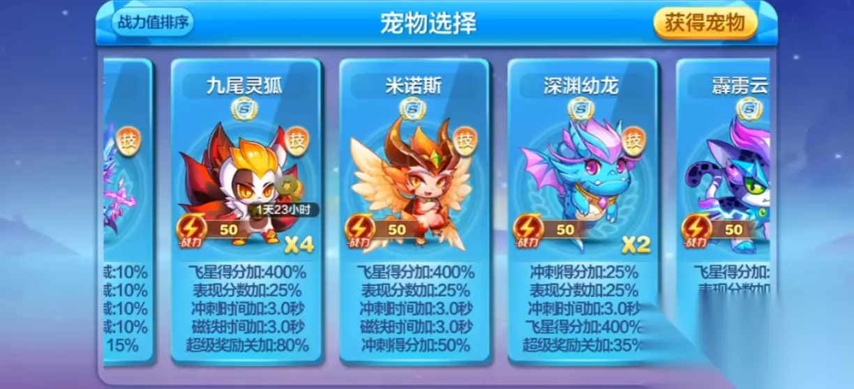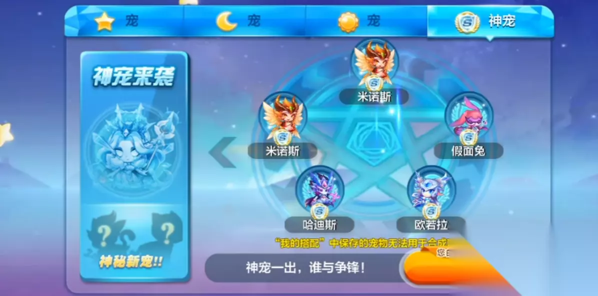 攒够太阳宠就能冲击S级神宠了!随便挑5只太阳宠,加上288钻石就能合成,结果完全随机,可能出米诺斯、守望者或者霹雳云豹啥的。如果手上有九尾灵狐这种能定期产星星钥匙的实用宠,尽量别拿去合成,优先用深渊幼龙这类属性普通的去碰运气。