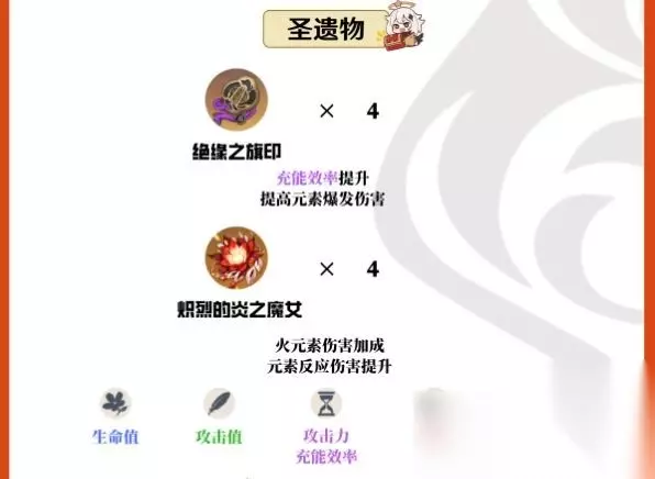 因为香菱的主要输出来源于元素爆发,所以尽可能的使每一次元素爆发CD结束都有元素爆发可以释放就成为了一个关键点。 所以,当前可以选择【绝缘之旗印】4件套,其2件套可以提升充能效率20%,而4件套中提升自身的充能效率可以反哺提升元素爆发伤害; 除此之外,可以选择增加元素反应伤害的【炽烈的炎之魔女】4件套、【魔女2+宗室2】等搭配。 对于主词条: 如果武器副词条为充能效率,那么时之沙可以选择百分比攻击、充能效率;而武器为非充能效率副词条,那么时之沙更多还是选择充能效率; 空之杯在原则上选择火元素伤害加成,除非为攻击杯的副词条属性要远优秀于火元素杯子才会选择攻击杯; 在不计理之冠的情况下,如果暴击率过低(50%以下)那么理之冠选择暴击率,如果过高(70%)以上那么选择暴击伤害,在50-70%之间都可以选择。 对于副词条:有效词条为充能效率、暴击伤害、暴击率、百分比攻击等。