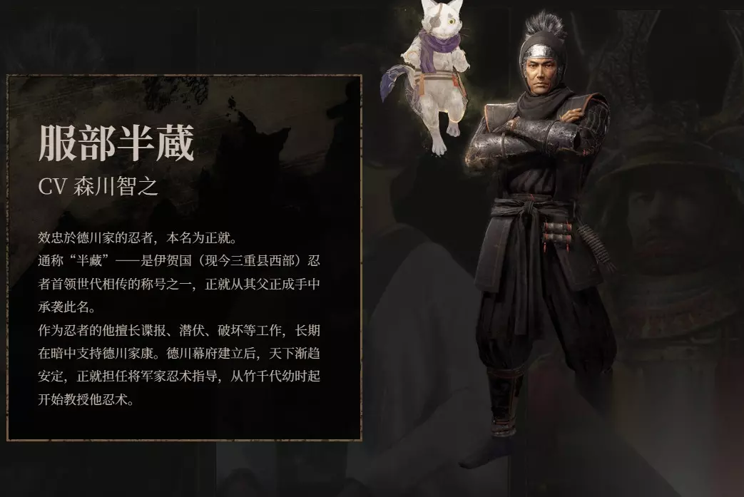 此外,《仁王3》官网还发布了其他角色的日文配音演员: 柳生宗矩 CV 内田直哉 德川将军家的剑术指导。 柳生宗矩出身剑术名门,其父柳生石舟斋曾因向德川家康展示“无刀取”绝技而深受赏识,以此为契机父子二人出仕德川麾下。 宗矩在关原之战中建立战功,不仅重振家声,收复旧领,更创立柳生新阴流,成为德川将军家的剑术指导。竹千代自幼随他修习剑术。 服部半蔵 CV 森川智之 效忠于德川家的忍者,本名为正就。 通称“半藏”——是伊贺国(现今三重县西部)忍者首领世代相传的称号之一,正就从其父正成手中承袭此名。 作为忍者的他擅长谍报、潜伏、破坏等工作,长期在暗中支持德川家康。德川幕府建立后,天下渐趋安定,正就担任将军家忍术指导,从竹千代幼时起开始教授他忍术。