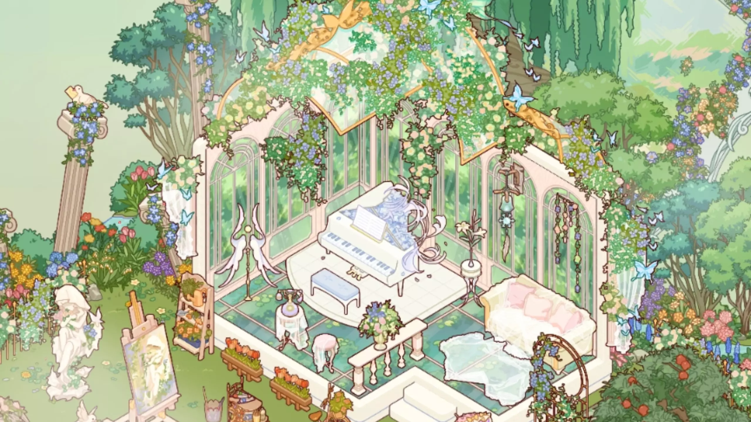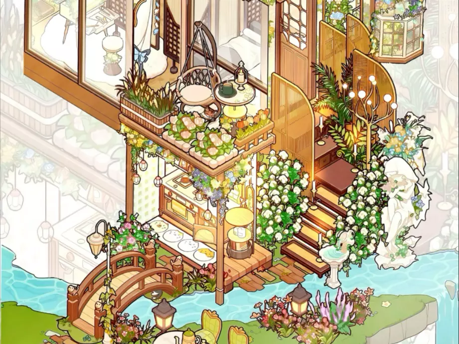 这是《我的休闲时光》里的蜗居物语“印象诗园”,将小屋与春日自然景致完美融合,小屋被繁茂花草环绕,还有溪流、水车点缀,内部布局温馨且充满自然气息,尽显春天的朦胧美感,是充满治愈感的春日蜗居设计。