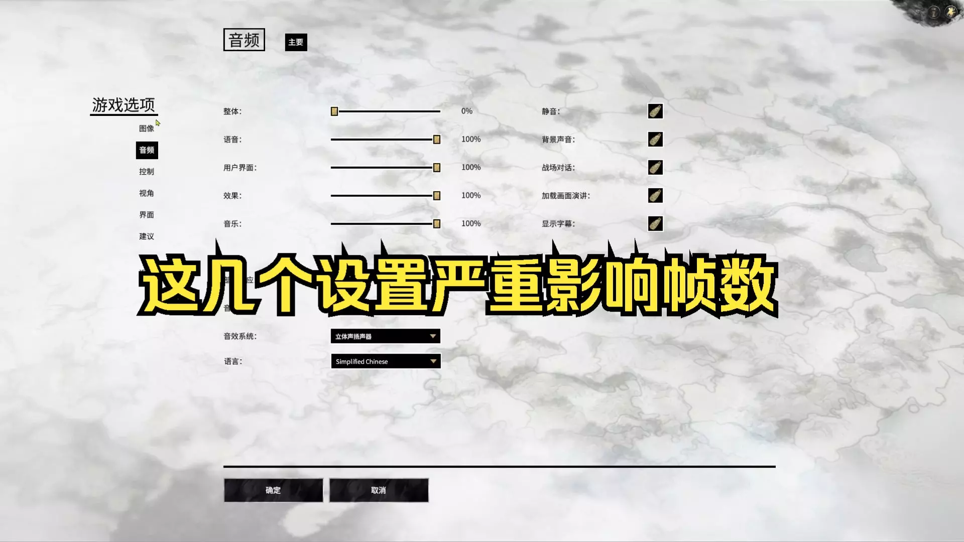 阴影细节:中 光滑表面反射:关 草地和树木:较低 部队细节:较低【帧数影响较大】 环境光遮蔽和屏幕空间阴影:关【影响巨大】 视频内存无限制:关
