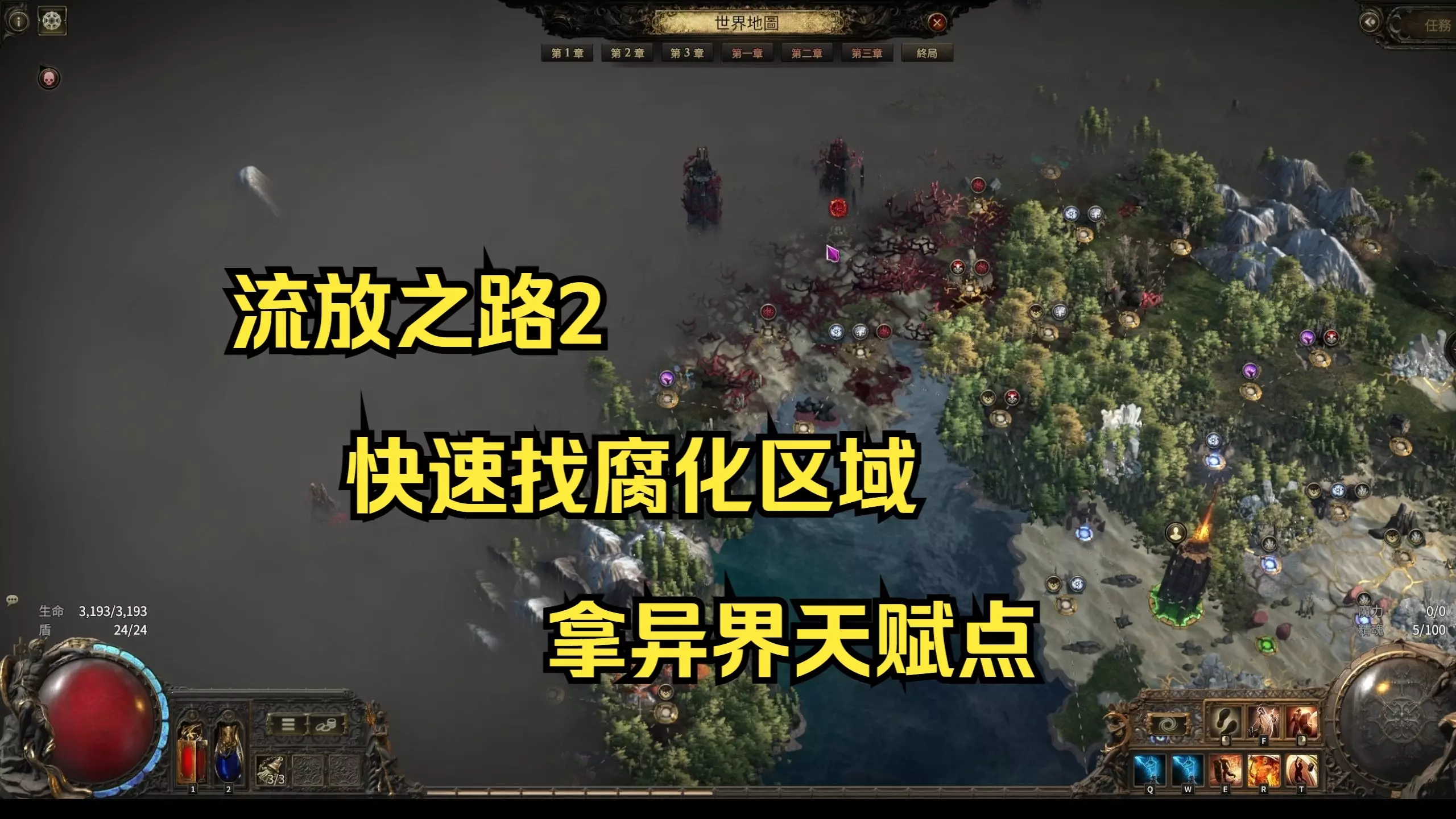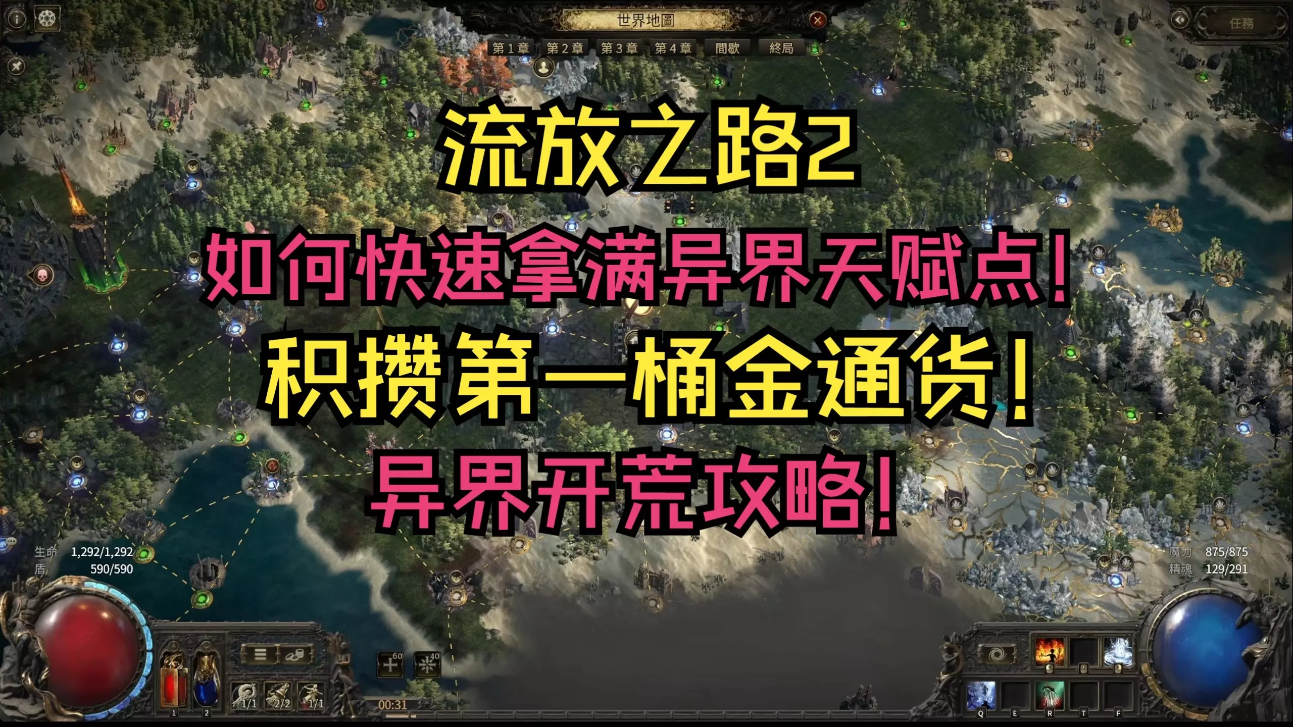 这是《流放之路2》的游戏攻略,介绍玩家刚进入异界后要做的第一件事是解锁异界天赋点,还展示了游戏内的相关操作场景,同时提及可在千岛、千岛电玩平台进行游戏道具交易。