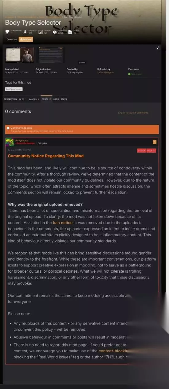 公告原文翻译如下: 该模组一直以来都很可能将继续成为社区内的争议源头。经过全面审核,我们确认模组内容本身未违反社区准则。但由于该主题极易引发激烈甚至恶意的讨论,评论区将保持关闭以防止事态升级。 关于原上传内容为何被移除?此前围绕原文件下架产生了诸多猜测与不实信息。特此澄清:该模组并非因内容违规被移除。如封禁通知所述,下架原因是上传者的行为失当。其在评论区明确表达了煽动争议的意图,并推广了一个专门用于发布挑衅性内容的外部网站。此类行为直接违反了我们的社区标准。 我们理解此类模组会引发关于性别与身份认同的敏感讨论。虽然这些议题很重要,但本平台的宗旨是支持模组创作的表达自由,而非成为更广泛文化或政治辩论的战场。我们绝不容忍由此引发的引战、骚扰、歧视或其他任何形式的恶意行为。 我们的核心承诺始终如一:确保模组社区对所有人保持开放与包容。 请注意: • 任何重新上传该内容,或意图规避本政策的衍生内容,都将被删除 • 评论或帖子中的攻击性行为将招致管理措施 • 无需举报本模组页面。若您不希望看到该内容,建议使用内容屏蔽工具屏蔽"现实社会议题"标签或作者"7H3LaughingMan"