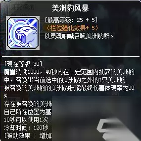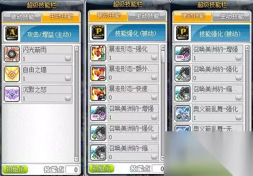 3、超级技能部分: 主动技能:闪光剑雨、自由之墙、沉默之怒 被动技能:召唤美洲豹-增强、暴走形态-强化、奥义箭乱舞-强化、奥义箭乱舞-无视怪物防御、奥义箭乱舞-首领怪伤害 最后加点完成图: