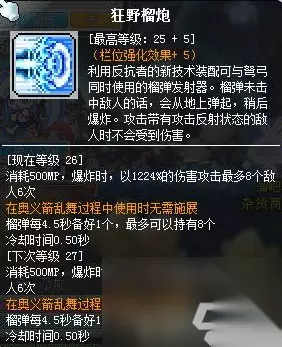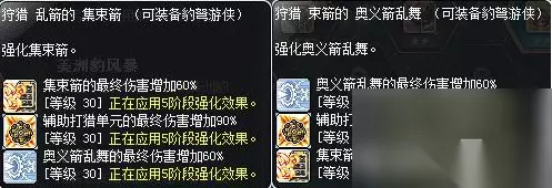 4、超级属性选择: 普通玩家可以考虑优先选择均点加暴击伤害、伤害、首领怪伤害、无视防御这几个,暴击率后期不满的情况下,稍微加几点也是可以的。前期敏捷可以考虑点个1-2点(30~60点敏捷性价比还是可以的,虽然不继承百分比装备叠加),前期如果神秘不够的话,可能做无名村任务有点难受,可以考虑加几点神秘,打怪没那么吃力。后续由于超级属性点可以重置,因此后续可以根据实际情况,自己调整需要的属性。 5、V矩阵技能选择: 豹弩游侠3合1核心比较固定,分别为:集束箭、辅助打猎单元、奥义箭乱舞。 参考下图(顺序没关系,凑2个不同开头的这三个技能核心就可以了,打boss可考虑奥义、召唤美洲豹、终极):