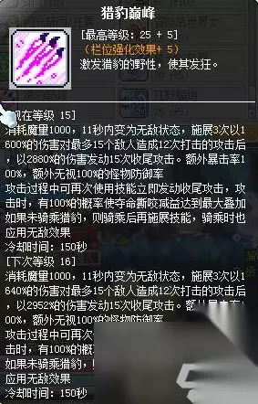 对于老玩家而言,不存在加错技能点的问题,只有加点顺序的问题,这个需要大家注意。 豹弩游侠是为数不多自带骑乘并且在骑乘上进行攻击的职业,豹弩游侠有两种形态(分别为骑乘豹子的状态和非骑乘状态),骑乘状态可以实现100%稳如泰山,移动速度高达190%,二段跳变成三段跳跃。还可以召唤美洲豹,增加自身爆伤,并且豹子会攻击敌人,给敌人施加一个撕咬的状态效果(有概率成功,但是在束缚击的状态下为100%施加该效果):