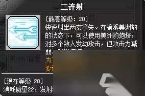 没有推荐黑色系副手和寻宝是因为这两者都是穿上后无法交易,而上面提到的这两种副手,后续更换的话还可以丢拍卖转手回笼资金。除非为了凑套装,不然还是不推荐用寻宝和黑色系副手。 2、升级技能选择: 1转使用二连射升级(前期可以点一点二阶跳):