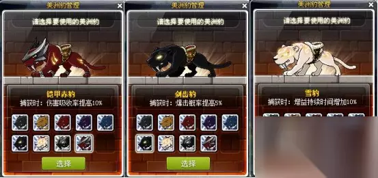 总体而言,豹弩游侠骑乘状态刷怪升级,非骑乘状态下打BOSS。该职业是一个输出很高,同时也具备灵活性的职业。缺点是非骑乘状态下灵活度有所降低,并且buff技能和攻击技能比较多,死亡后需要一定的时间补充buff技能,操作上有些许繁琐。高配玩家可以通过搭配战斗机器人来避免死亡带来的buff消除。 豹子有一个小窍门,玩家最好可以把所有豹子都抓一遍: