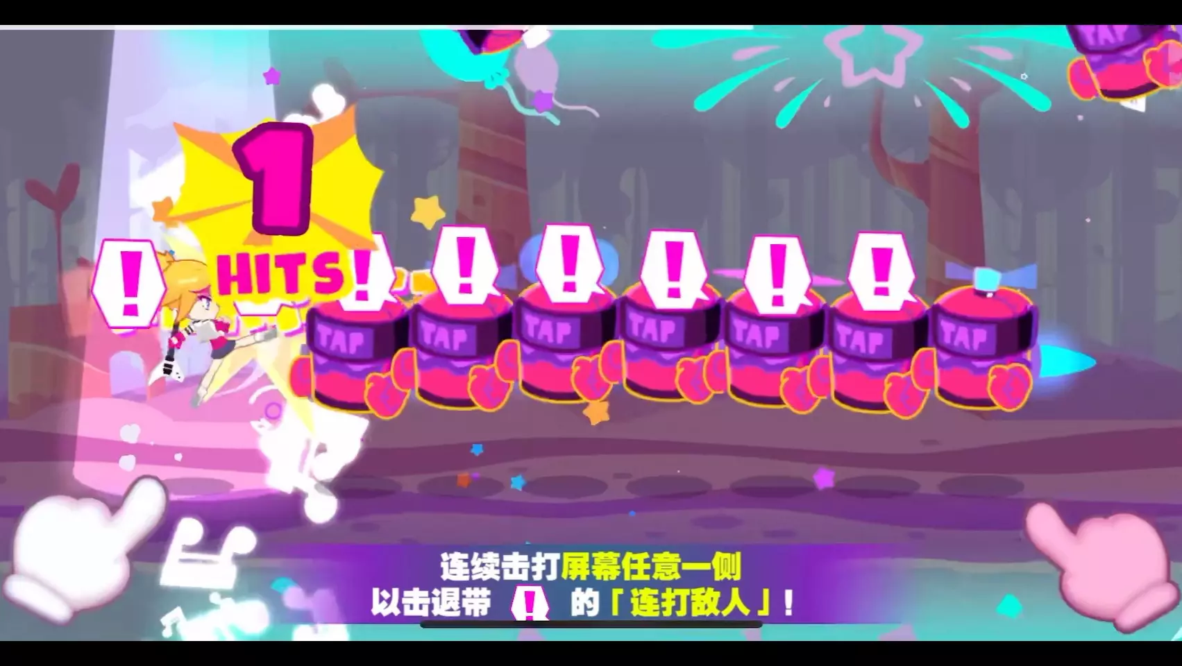 这篇内容介绍了音乐游戏Muse Dash的愚人节新手教程环节,展示了游戏里打击空中、地面敌人,跳过障碍等操作指引,是新手入门该游戏的趣味内容。
