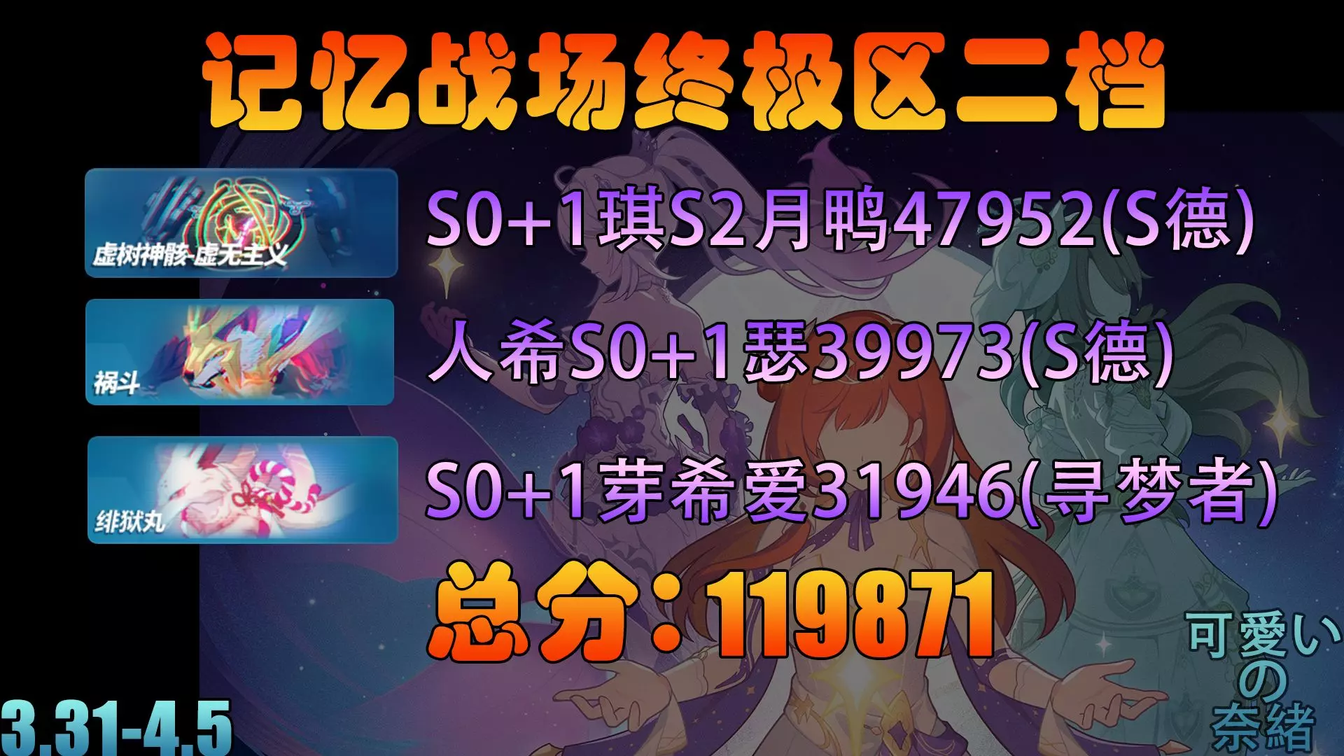 这是《崩坏3》iOS终级区记忆战场3.31-4.5的一档119900合辑,展示了琪亚娜等角色挑战sss虚无主义、sss祸斗、ss绯狱丸的超高顶分打法,还呈现了对应角色的武器圣痕配置。