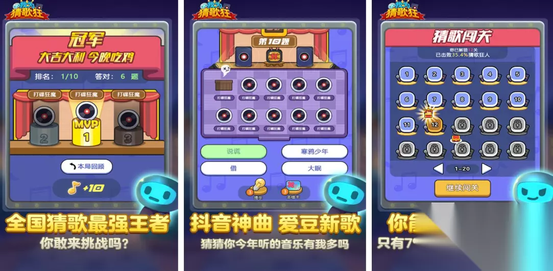 猜歌闯关高手都可下载我为猜歌狂这款APP挑战下,这款猜歌手游包含的歌曲千奇百怪,就连纯音乐和一些动漫主题曲都包含其中,抖音神曲的加持更让游戏代入感更强,关卡设定方面超级多让大家尽情享受猜歌的乐趣,四选一的闯关操作机制也是这款神作的亮点,休闲时刻进入本作听歌、猜歌会排解压力。 高速下载 普通下载
