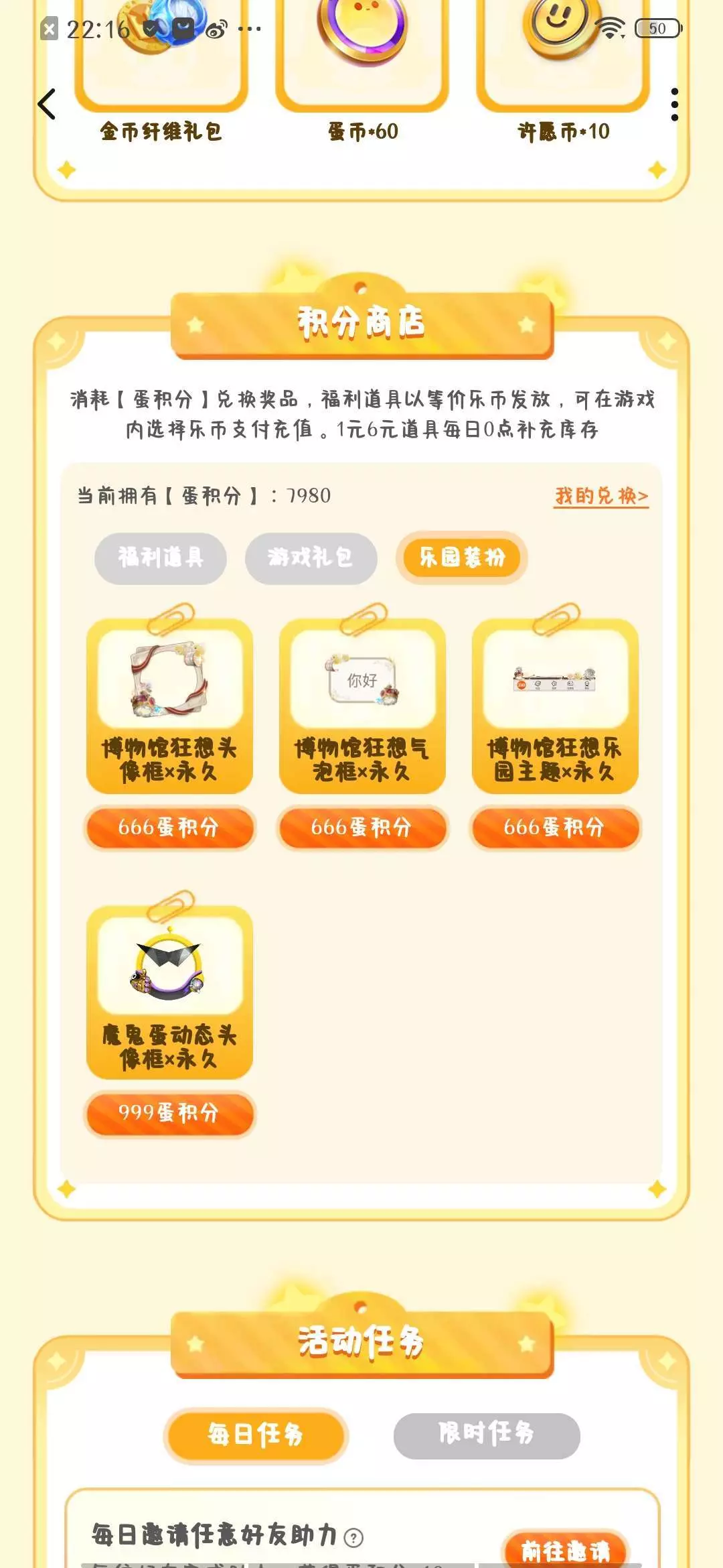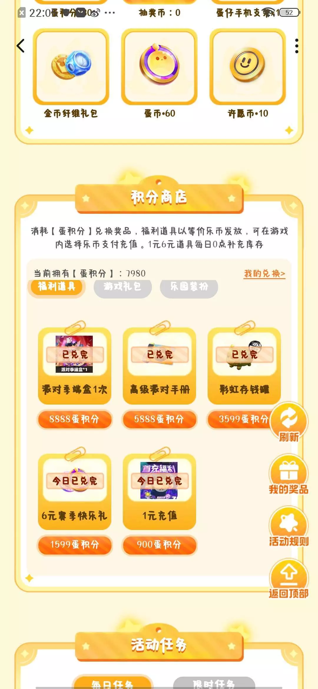#福利推荐 推荐玩蛋仔的玩家去看看这福利,只要你每天做完相对应的任务,就会获得抽奖机会,有了抽奖机会,你就可以去抽奖页面抽奖,运气好可以抽到蛋仔周边、许愿币、蛋币、赛季端盒十连、纤维金币礼包等等好礼,保底是30积分,积分可以兑换赛季十连端盒一次(8888积分)高级派对手册(5888积分)6元赛季快乐礼(1599积分)一元充值(900积分)11月改名卡礼包(2800积分)12月改名卡礼包(2888积分)烟花纤维礼包(688积分)博物馆狂想头像框、气泡框、乐园主题x永久(666积分)魔鬼蛋动态头像框x永久(999积分)每月的任务共四个,任务做完的抽奖机会也是4个,如果运气不好抽到的全是积分,一天就是120积分,只要你愿意花些时间做任务拿积分,几天之后你就能白嫖到那些好礼了!除了这些你也可以找好友帮忙助力(新老用户累积助力三次有1500积分)