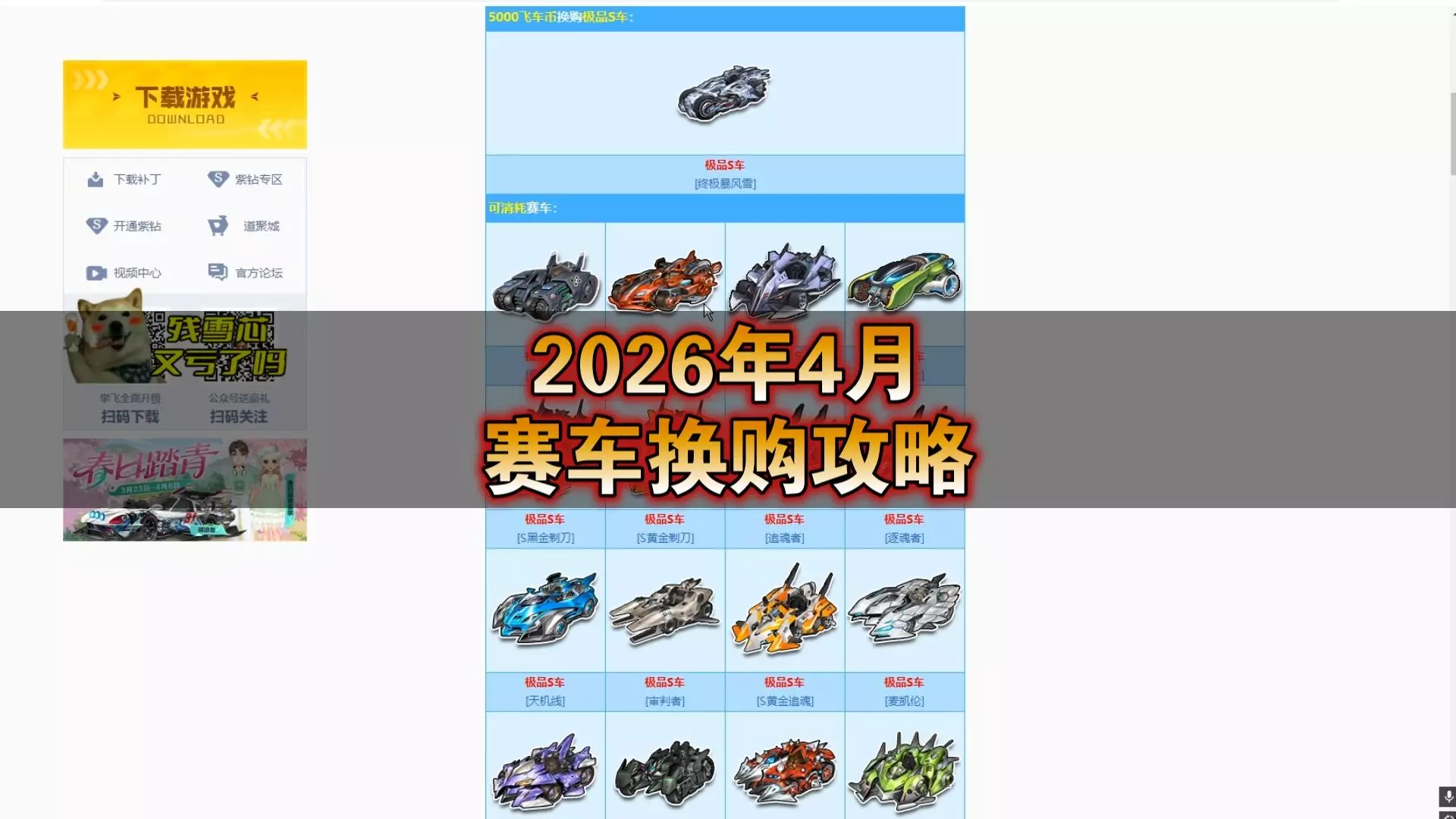 这是残雪芯分享的QQ飞车2026年4月赛车夺宝攻略,介绍了夺宝可获取的多款极品S车、T2、T1赛车,还给出了赛车选择建议,比如只想要S车可参考相关测评,不推荐敖丙皮肤等。