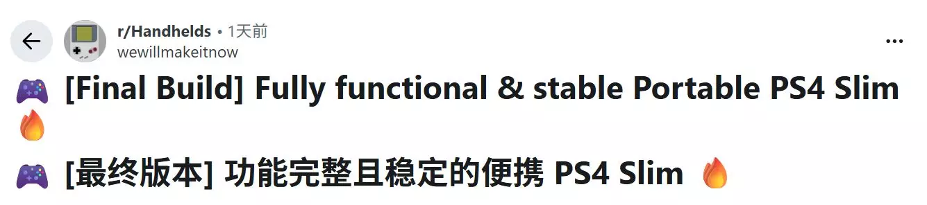 最近,Reddit论坛上一位叫“wewillmakeitnow”的硬件改装爱好者,自己动手做了一台能拿在手里玩的PS4掌机。和索尼官方出的那个只能串流的PlayStation Portal不同,这台机器是实打实地能本地运行PS4游戏。
