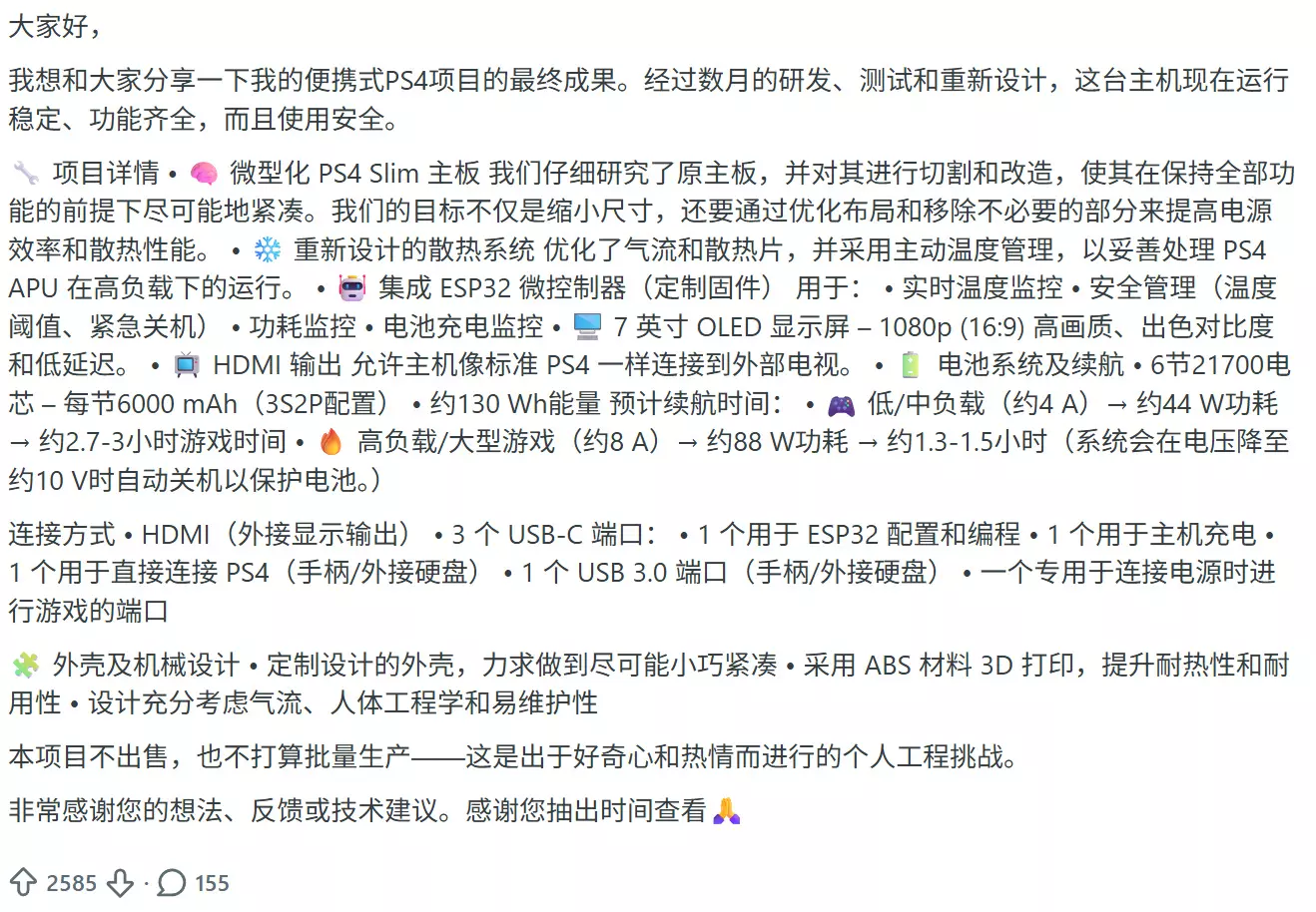 索尼现在出的PS Portal必须连着网络,还得有台PS5才能用。很多玩家其实想要一台真正能独立运行PS4游戏的掌机,就像以前的PSVita那样。这个改装作品正好说明,技术上是可以实现的,而且效果还不错。不过很可惜,这只是个人作品。作者暂时没打算卖,也没公开制作图纸。但这次改装至少证明了一件事:玩家对便携式主机的需求是真实存在的。说不定哪天,索尼会公布一台真正的PS掌机。