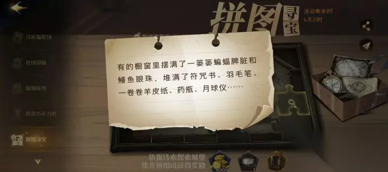 碎片线索三:有的橱窗里摆满了一篓篓蝙蝠脾脏和鮼鱼眼珠,堆满了符咒书、羽毛笔、一卷卷羊皮纸、药瓶、月球仪……