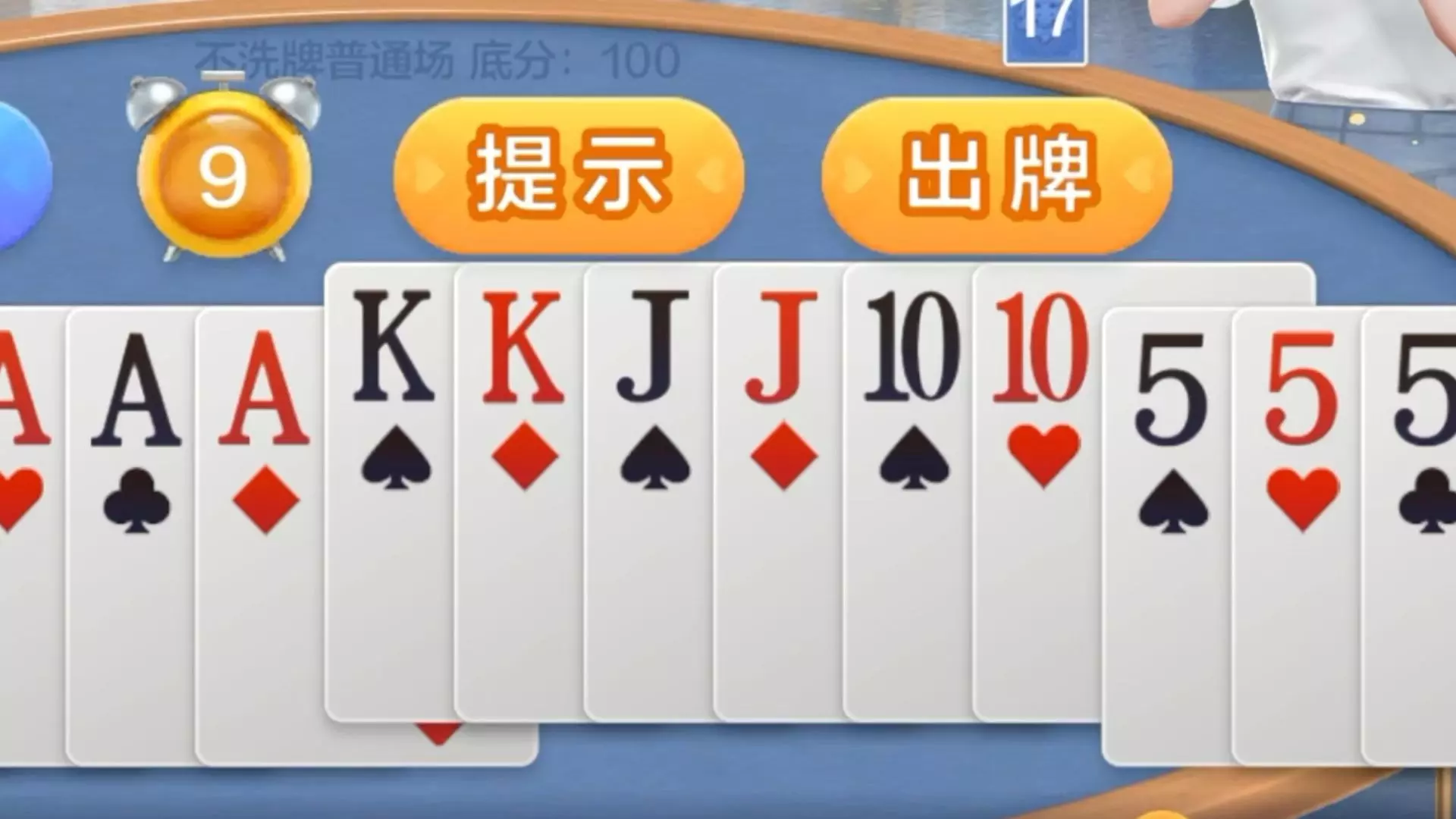 这是一则欢乐斗地主的搞笑对局内容,玩家作为地主,手持三张2、三张A、三张K,尝试出牌时被提示牌型不符合规则,还出现队友出对Q、自己摸到四张8的趣味场景,引发关于牌型能否“起飞”的趣味疑问。