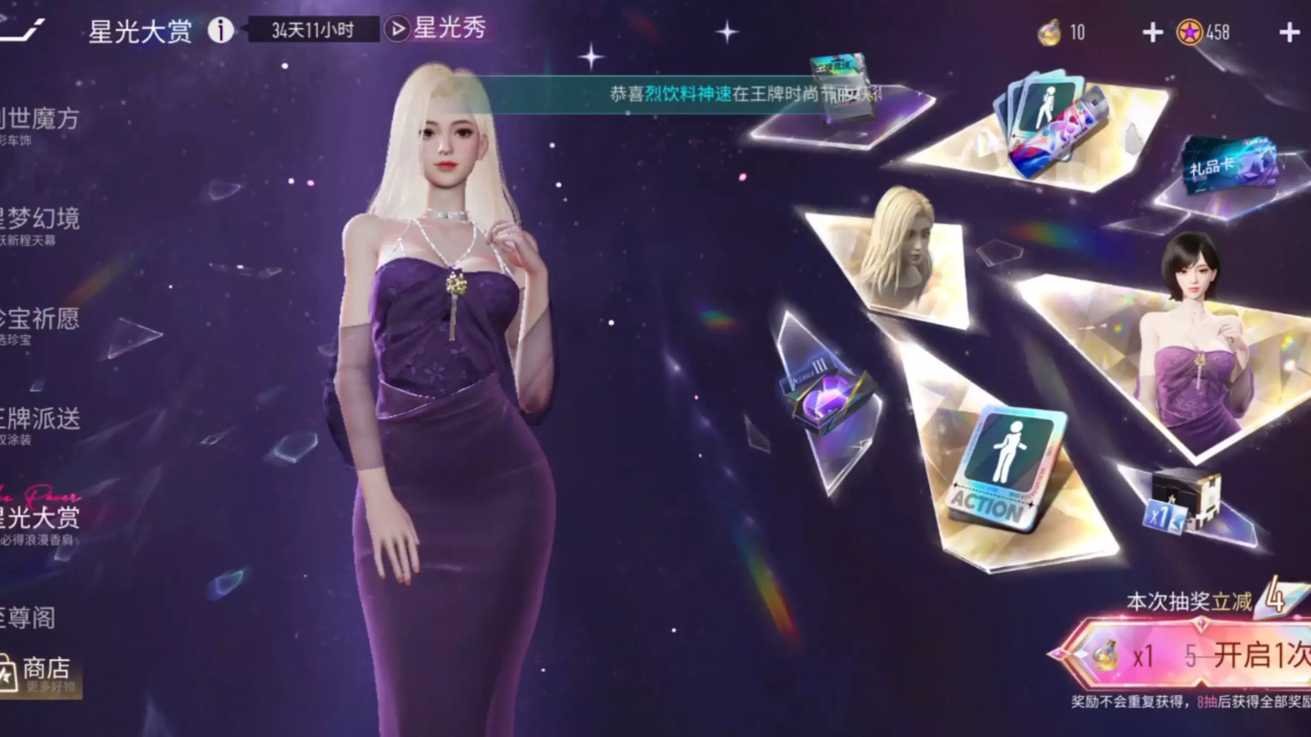 这是游戏《王牌竞速》星光大赏活动的抽卡内容,活动8抽必得夜上海相关奖励,展示了抽卡获得炫彩喷雾等道具的过程,还展示了情迷夜上海、绛紫夜上海套装外观。