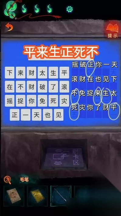 2、解密方法 在获得LED屏的线索后,使用女主的房卡解锁机器然后进行方阵解密,将黑无常的帽子上的字竖向记录; 因为右上角是天,所以天下太平是最右侧; 按照从右往左的顺序将出现的文字排列,就可以得到正确的方阵了,对应屏幕数几个文字位置即可完成解密。
