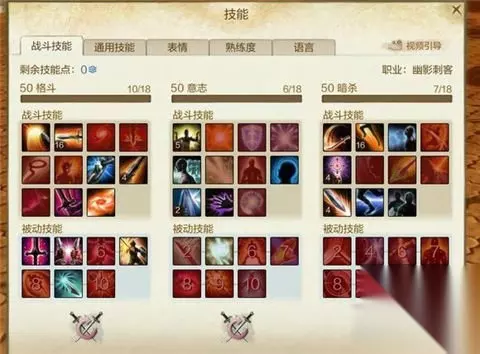 格斗我点出了突击,三段,挣脱,致命,战神,杀戮。被动1246。 意志我点出了威慑,闪现,唤醒,天神,迷扰。被动2 暗杀我点出了凌风,飞刺,后跳,标记,影袭,疾风步,残影步。被动无 然后技能排版图:
