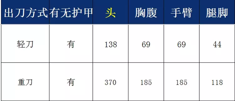 该武器的面板数据为威力45、便携93,范围79,威力一般,便携极高但范围一般。具体实战伤害如下图,技能较少,英雄级技能只有急行军和快手。在实际战斗中,它必须足够贴脸才能击中敌人,而且伤害判定特殊,轻刀和重刀都是直拳攻击,只有准心部位准确命中才能造成伤害,因而导致命中较难,使用难度较高。轻刀是双拳连续攻击,而重刀则是右拳单独攻击。根据情况来看,轻刀比重刀更靠谱。