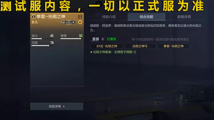 在同一背包内装备81式-光明之神、拳套-光明之神、光明之神弓可以激活套装技能:主武器弹匣子弹数+2。