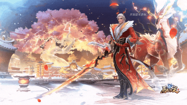 场景昼夜切换,白日宫闱飘雪伴龙梅,黑夜蜃楼绽放神兽烟花。