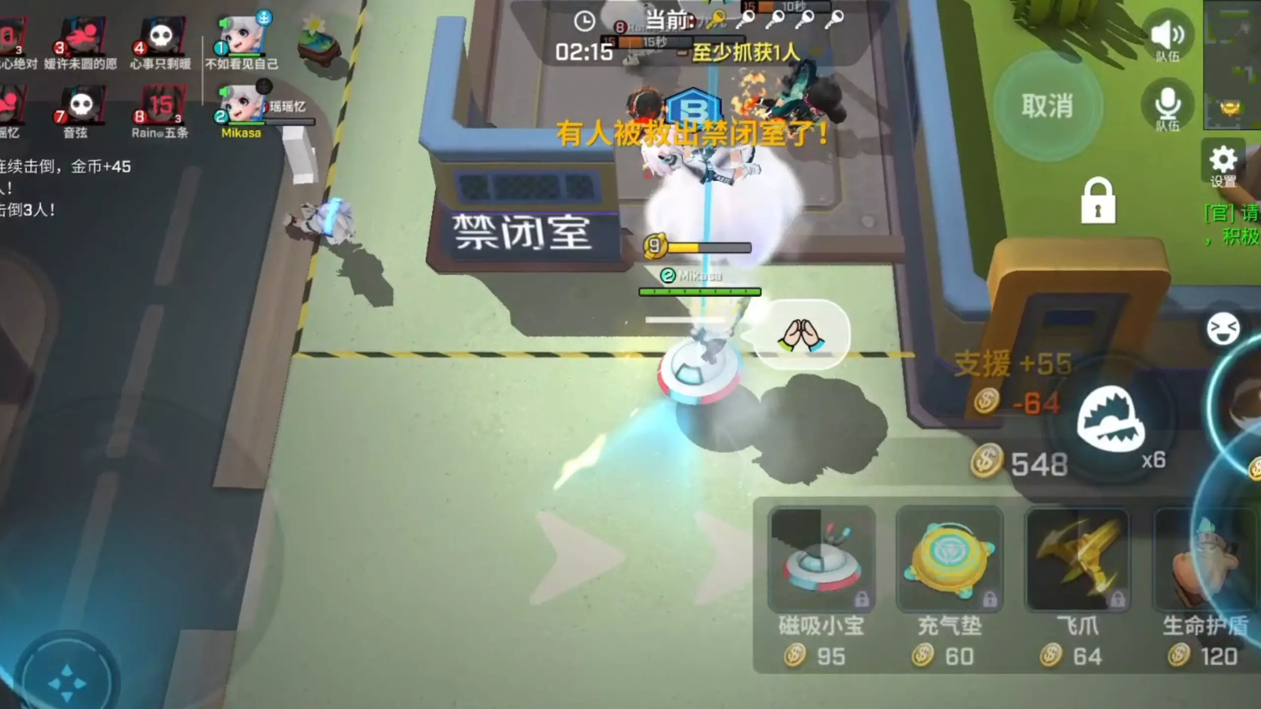 这是《逃跑吧!少年》的游戏对局内容,玩家使用“云朵小蛋糕”风格的追捕者角色,在对局里击倒逃生者、完成支援等操作,还展示了赛季宝藏界面,呈现了追捕者的对战过程。