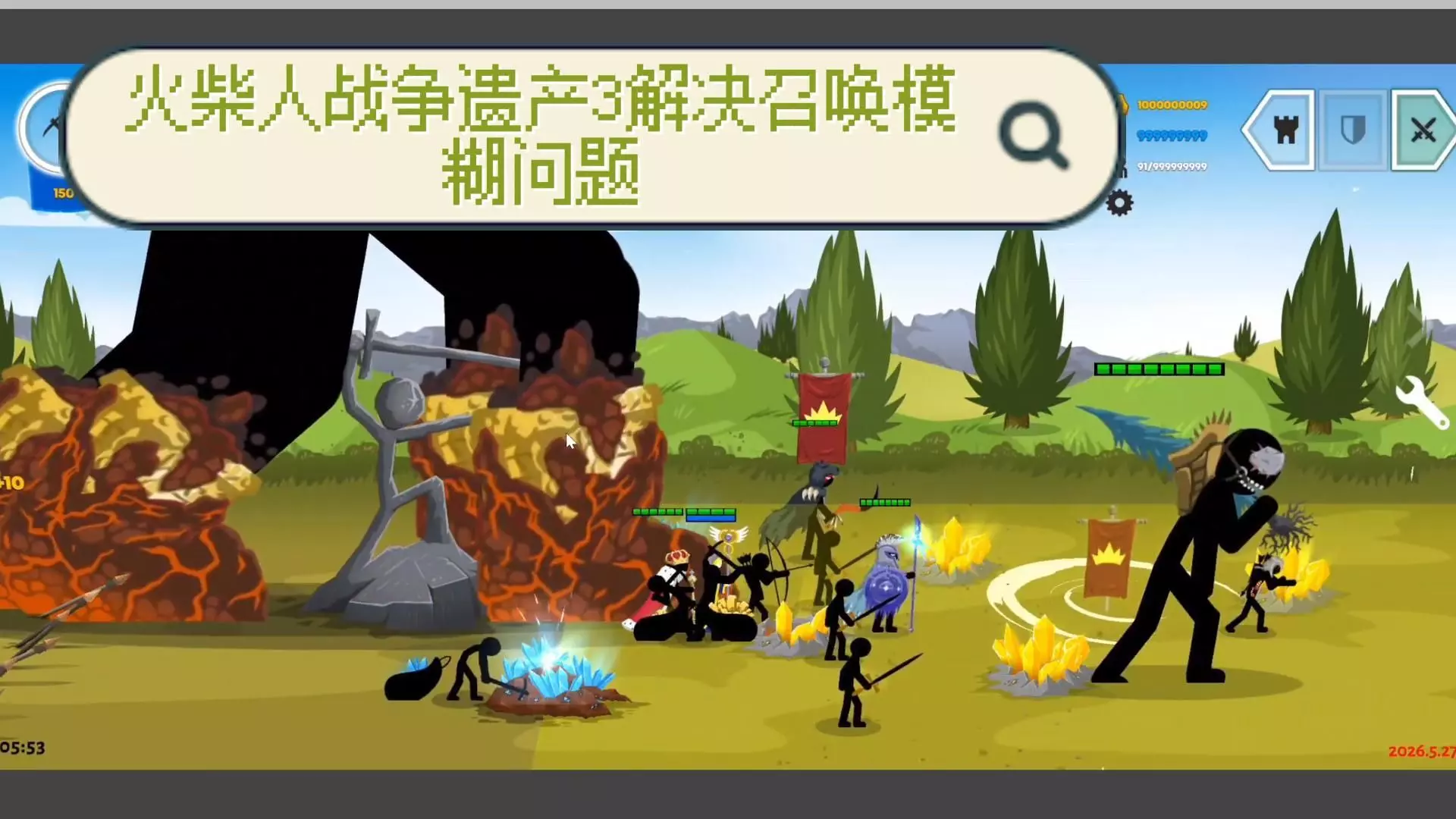 这是《火柴人战争遗产3》的第一期早期游戏实况录像,展示了在冰雪地图中操控火柴人战斗、占领中心塔等游戏内容,还能看到游戏的MOD界面与各类战斗操作按钮。
