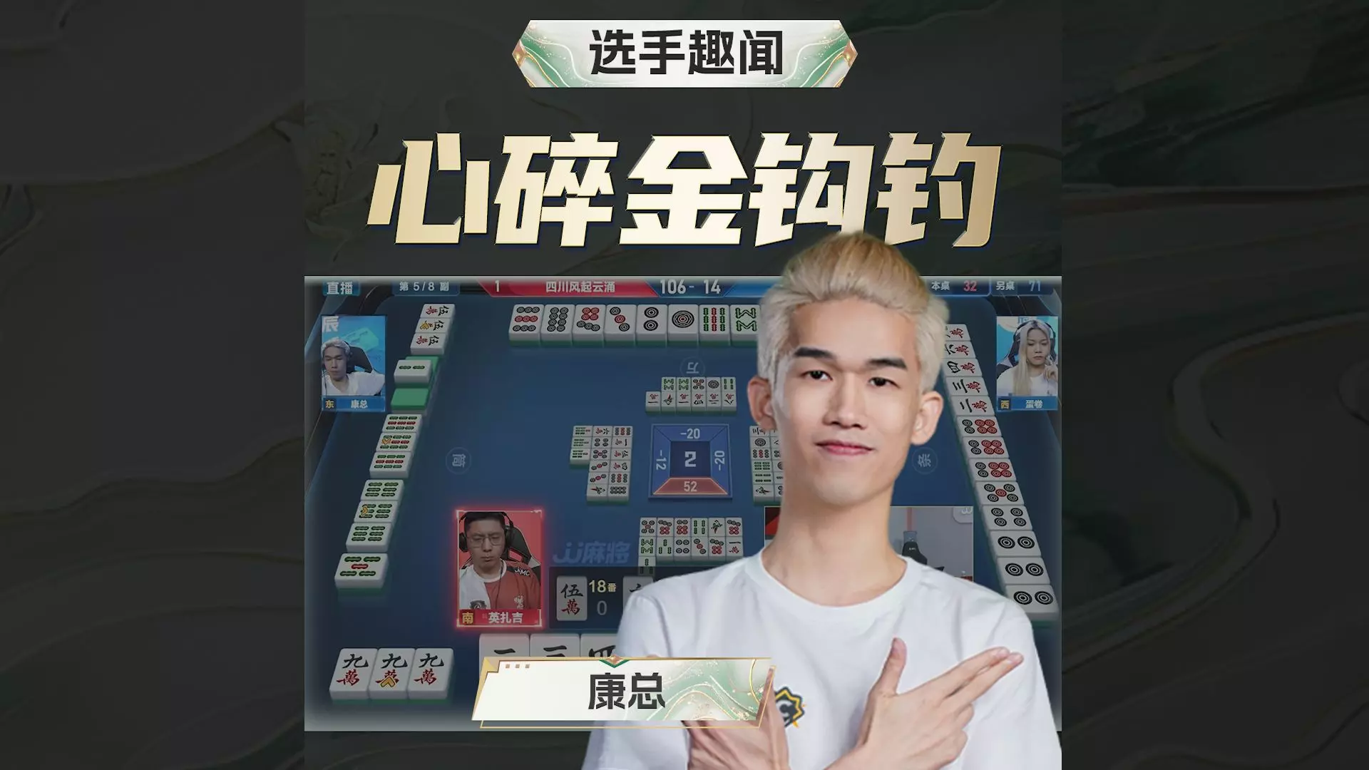 JJ麻将冠军杯C组赛场,上海太阳公社与四川风起云涌对战,选手喜多爱做出金钩钓大牌,收获32分,对手赔付分值高,展现了做大牌拿分的竞技策略。