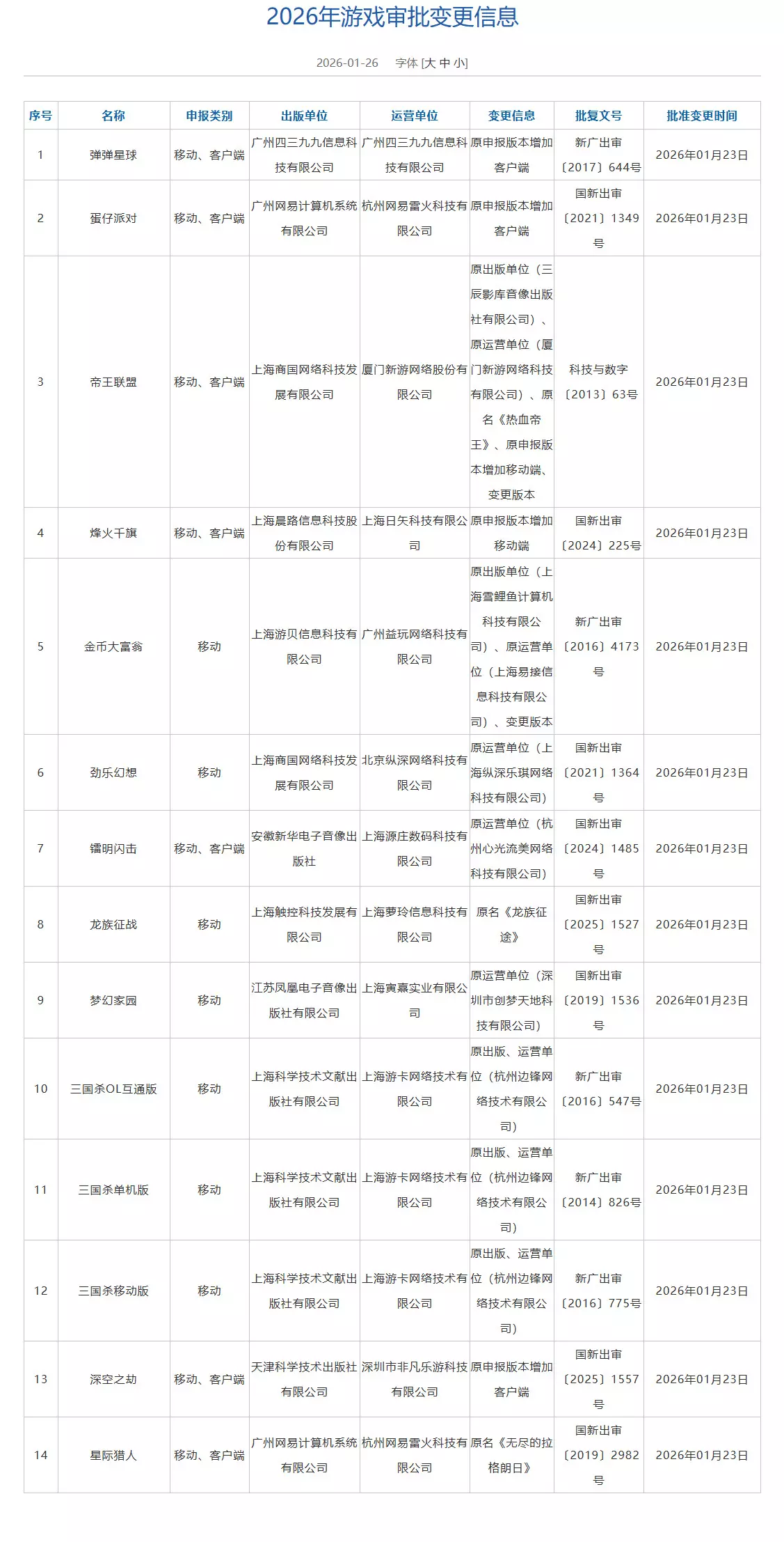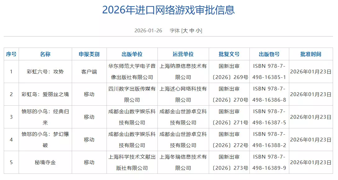 2026年1月游戏版号公开!177款国产网络游戏版号、5款进口游戏版号、14款游戏审批变更。其中《彩虹六号:攻势》申报的是客户端,《愤怒的小鸟:经典归来》《愤怒的小鸟:梦幻爆破》申报移动端。