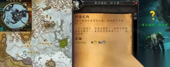 魔兽世界wlk邪能之约任务 接取等级:71 接取NPC:库尔迪拉・织亡者(龙骨荒野,阿格玛之锤) 完成NPC:库尔迪拉・织亡者(龙骨荒野,阿格玛之锤) 奖励声望:350点战歌远征军 任务流程: 1、首先我们前往龙骨荒野地图,找到库尔迪拉・织亡者NPC接取任务,具体坐标为(36.1, 47.5)。